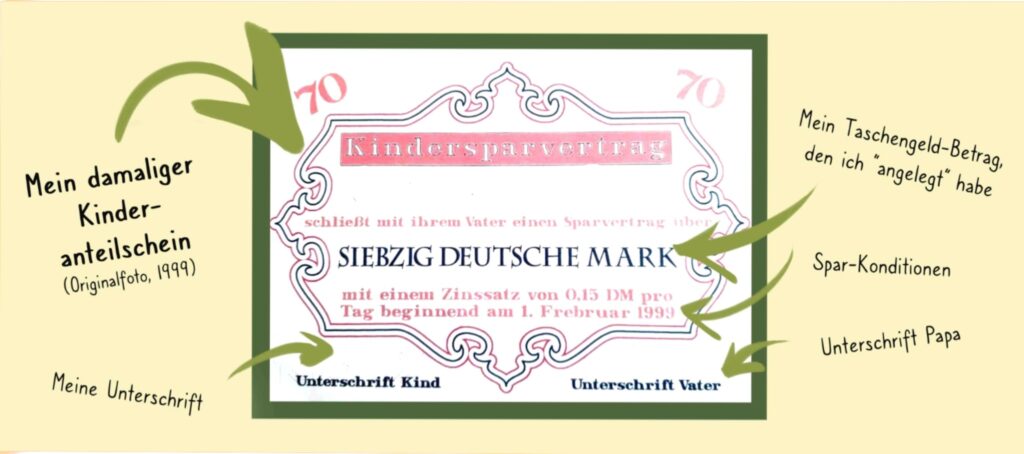 Wir (Sina und Marie) haben 2023 unseren Vater relativ plötzlich verloren. Während der Trauerphase sind wir auf alte Kindheitserinnerungen gestoßen und eine davon hat uns besonders bewegt und zu diesem Projekt inspiriert. Unser Vater hatte 1999 die Idee uns mit einem Kinderanteilsschein zu erklären wie Geldanlage funktionieren, indem wir unser Taschengeld bei ihm anlegen konnten (hier ein Originalfoto). Der Anteilsschein wurde auf ein DINA4 Blatt gedruckt und bei ihm verwahrt. Die Konditionen sind ebenfalls hier vermerkt: Zinssatz von 0,15 DM pro Tag beginnend am 01.02.1999. Wir waren so inspiriert von dieser Erinnerung, dass wir eine Geschichte darum entwickelt haben: „Warum sich warten lohnen kann“.